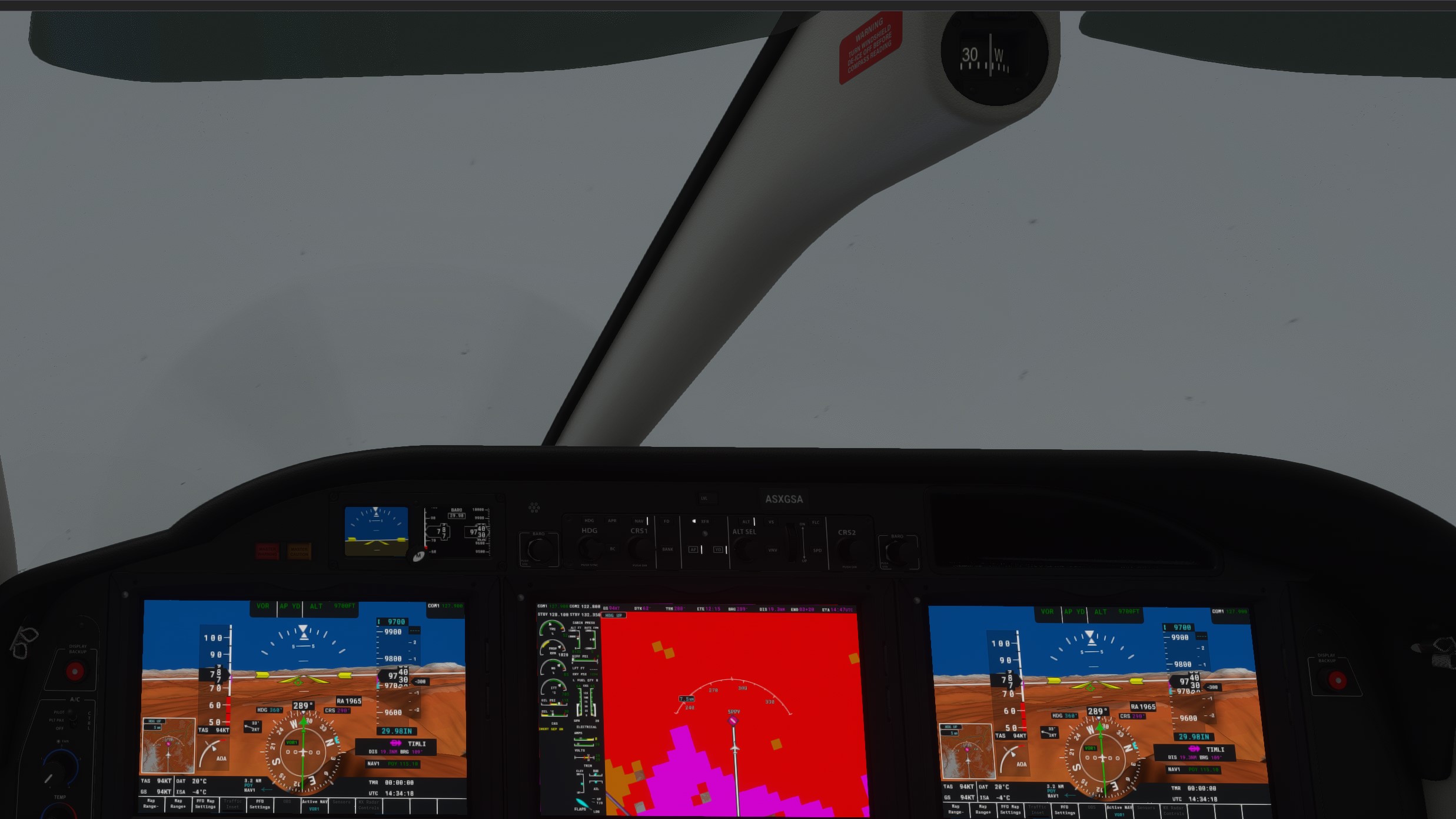 This is the arrival procedure, with the weather data in overlay. Not good. Red is bad, and purple is the worst. We need to start our descent now, and get very close to severe thunderstorms in the vicinity. We’ll have to skirt those thunderstorms somehow. Also, the ceiling is very low, so visibility as we approach the airport will be a problem. Remember, we have an instrumented arrival but there is no ILS for the runway, so the final approach needs to be visual.